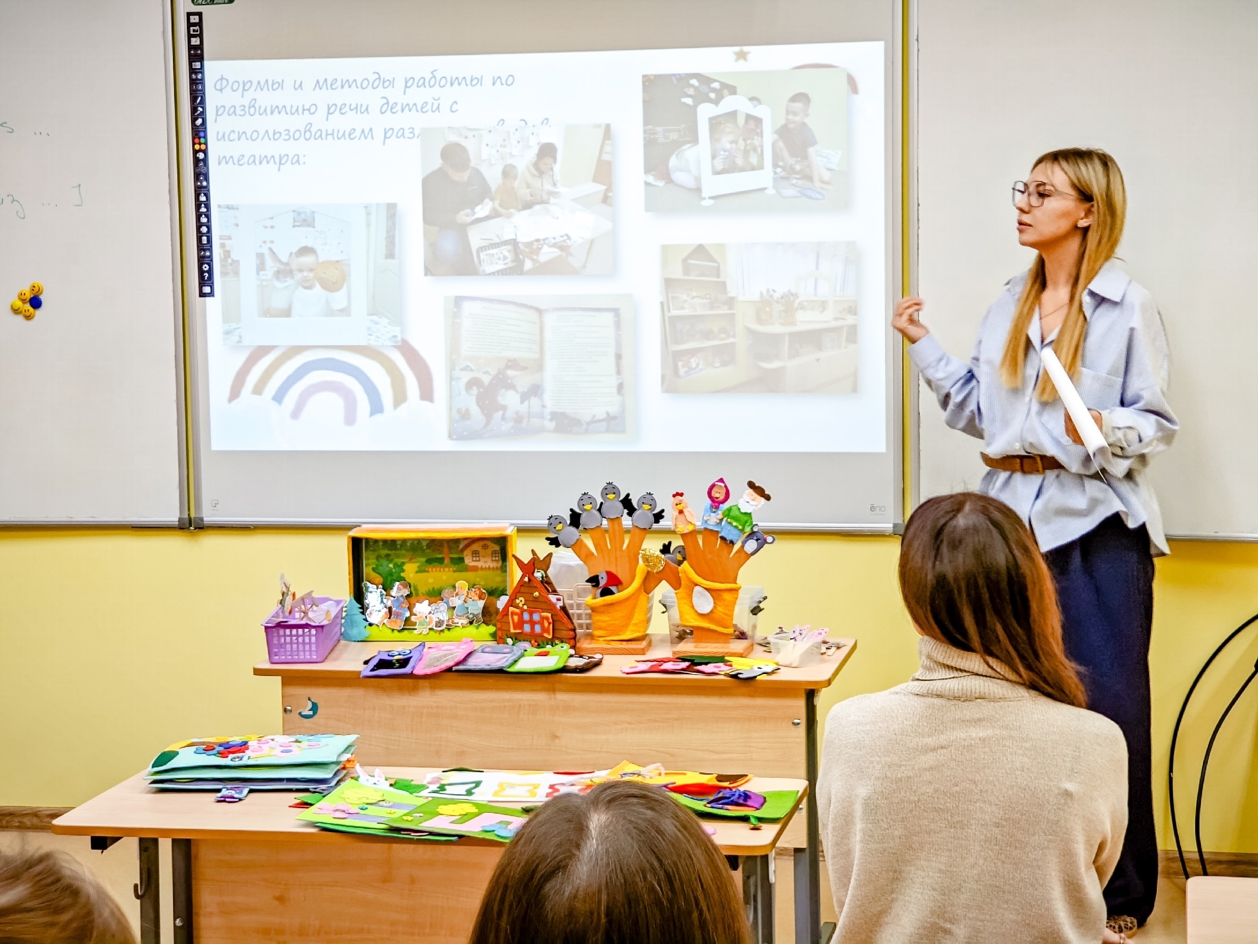 Не менее захватывающей стала презентация Анастасии Александровны, которая продемонстрировала разнообразные виды театрализованных игр для младших дошкольников. Педагог не просто рассказала о методиках — она показала настоящие шедевры, созданные своими руками: