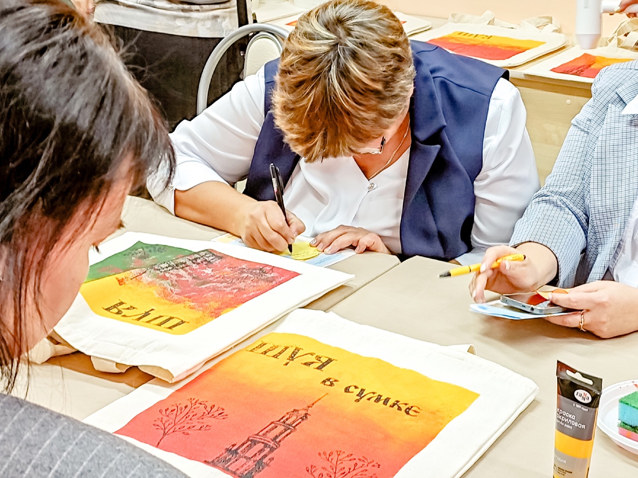Уникальное мероприятие — мастер-класс «Шуя в сумке» — стало настоящим открытием для всех присутствующих. Участники познакомились с древним промыслом ручной набойки на ткани. Каждый гость смог создать собственный шедевр — украсить сумку-шоппер изображением колокольни Воскресенского собора, символа нашего города.