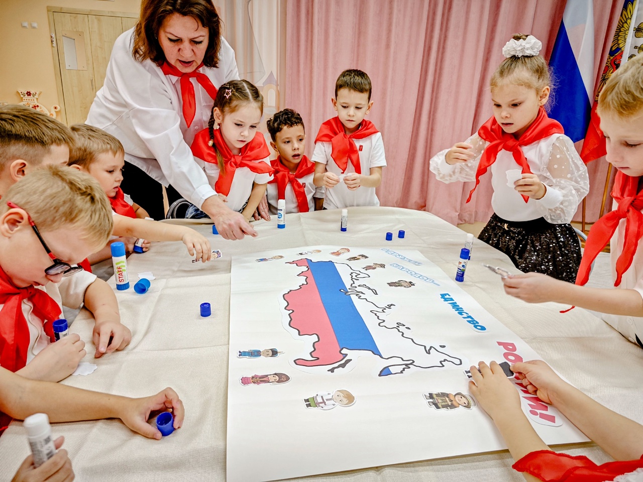 Сначала дошкольники посмотрели познавательный видеоролик. Из него они узнали, в чём заключается настоящая сила России: в единстве и сплочённости множества народов, в общей любви к Родине и бережном отношении к исторической памяти.